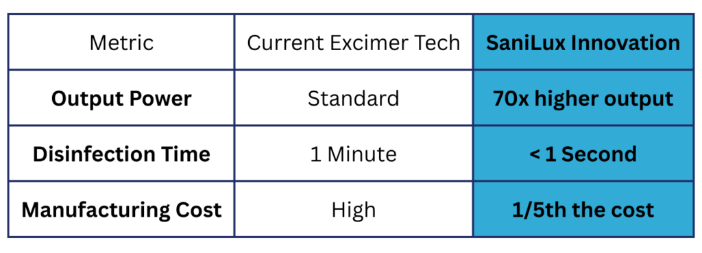 Conclusion: Despite the demand created by COVID-19, excimer adoption has been slow due to cost and performance issues. SaniLux solves both, unlocking the true future of safe air and surface disinfection.