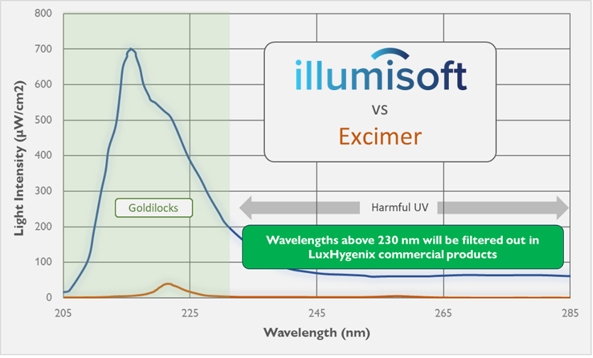 Recent performance data comparing output of LuxHygenix pre-production units with peak at 216 nm to that of a commercial excimer lamp (peak emission at 222 nm; optically filtered).